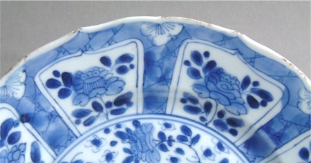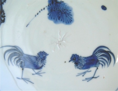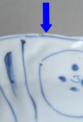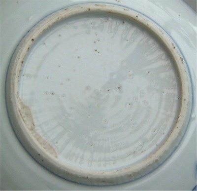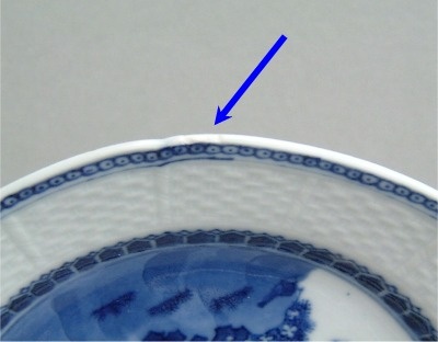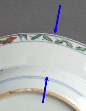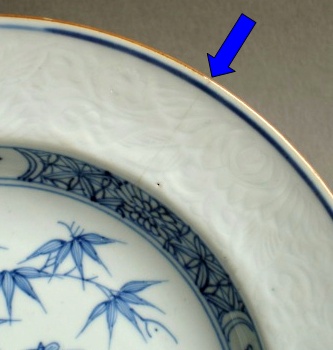 hairline crack. A tight crack, which may be unstained or stained. Modern restoration methods are often able to make such hairlines disappear. Here are three typical examples: 1) an unstained hairline crack on the rim of a Kangxi famille verte plate fritting. Fritting is the result of the glaze coming away from the body of the porcelain, and usually occurs on sharp edges. It was a particular problem for Chinese potters during the first half of the Seventeenth Century but can be found on export wares throughout the Eighteenth Century. 1) fritting on the rim of an Eighteenth Century Chinese export plate firing flaws. These are minor faults introduced during manufacture and typically include firing cracks in the body of the item, and glaze flaws where the glaze was either not applied to an area of the body, or has ‘crawled’ during firing. 1) firing cracks and glaze holes in the foot of an early Kangxi dish chatter marks. These are usually seen as radiating marks on the foot of Seventeenth Century items and were caused by ‘juddering’ of the potter’s knife while shaping the foot. They can be used as a sign of authenticity, but it should be noted that chatter marks have also been faked on later wares. 1) chatter mark and missing glaze on the foot of a Seventeenth Century bowl. |